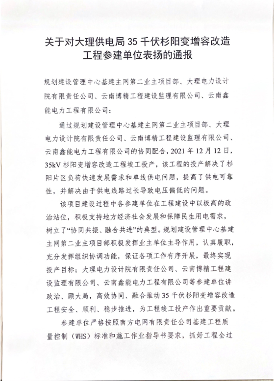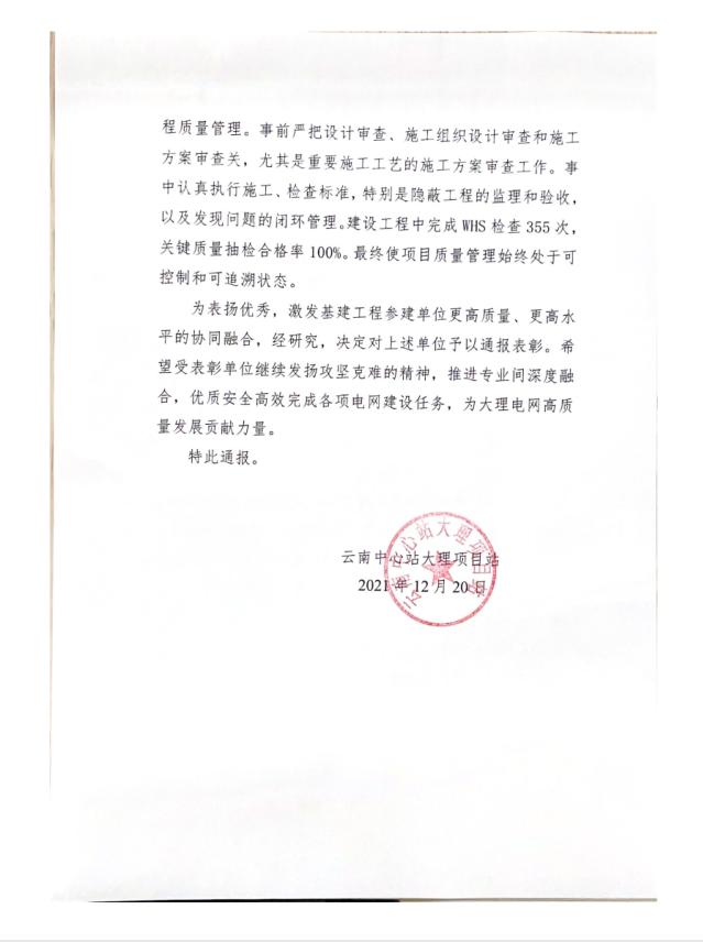 本項(xiàng)目順利投�(yùn),云南中心站大理�(xiàng)目站�(fā)文對(duì)各參建單位(�(guī)劃建�(shè)管理中心基建主網(wǎng)第二�(yè)主項(xiàng)目部、大理電力設(shè)�(jì)院有限公司、云南博精工程建�(shè)�(jiān)理有限公司及我公司)�(jìn)行了通報(bào)�?yè)P(yáng)�