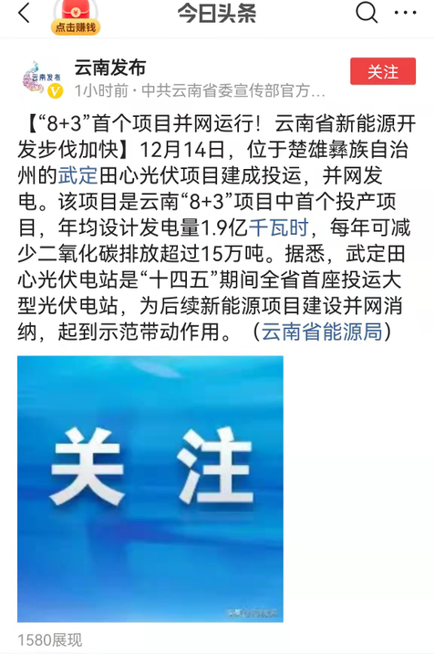 摘自云南省能源局�(fā)布的消息:��8+3”首個項目并�(wǎng)�(yùn)�!云南省新能源開發(fā)步伐加快��2021�12�14�,位于楚雄彝族自治州的武定田心光伏項目建成投運(yùn),并網(wǎng)�(fā)�。該項目是云��8+3”項目中首個投�(chǎn)項目,年均�(shè)計發(fā)電量1.9億千瓦時,每年可減少二氧化碳排放超�15萬噸。武定田心光伏電站是“十四五”期間全省首座投�(yùn)大型光伏電站,為后�(xù)新能源項目建�(shè)并網(wǎng)消納,起到示范帶動作用�