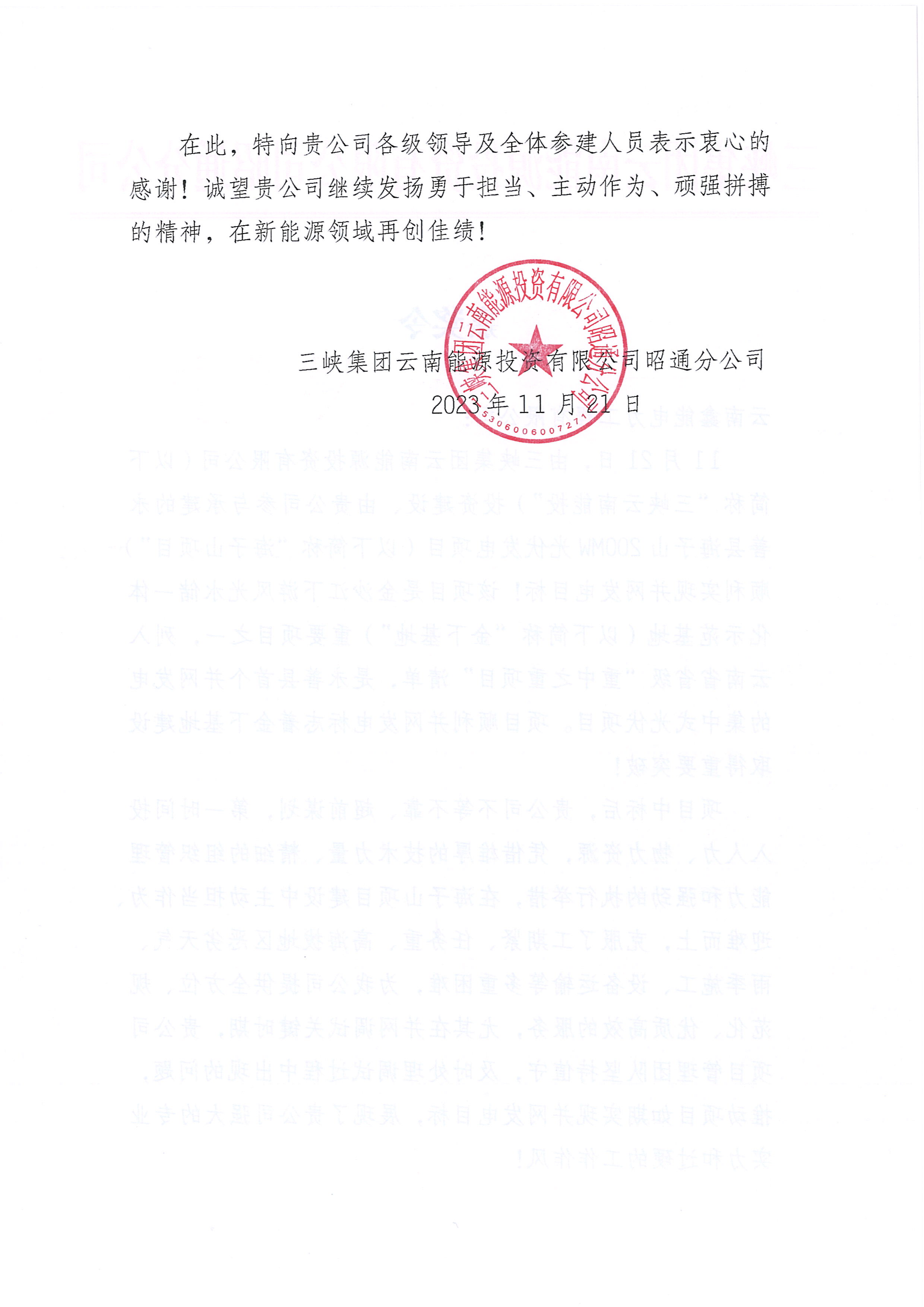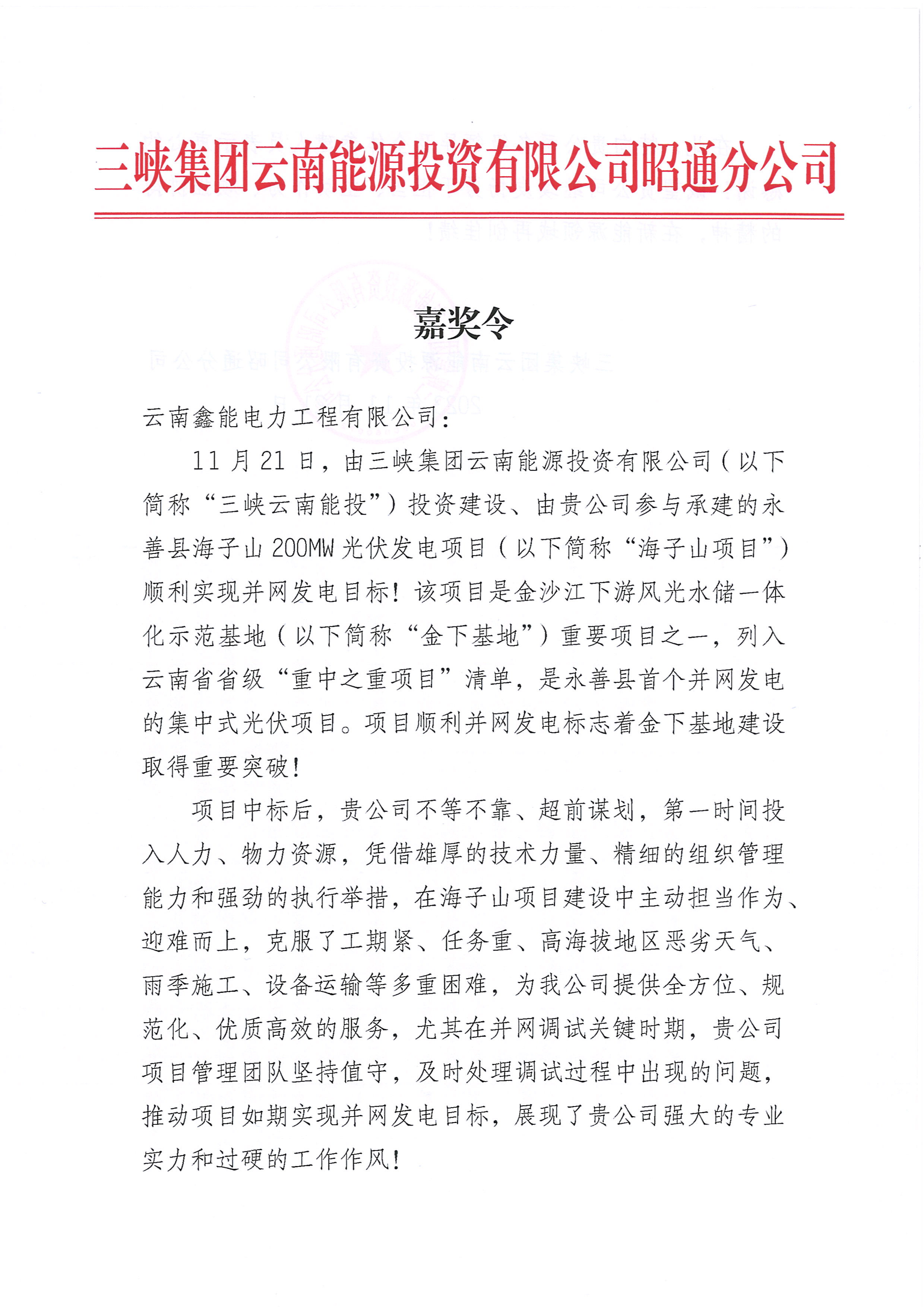 鑫能有幸參建的中國三峽云南省昭通市永善縣海子200MW光伏發(fā)電項(xiàng)目,于2023年11月20日升壓站順利并網(wǎng)運(yùn)行。